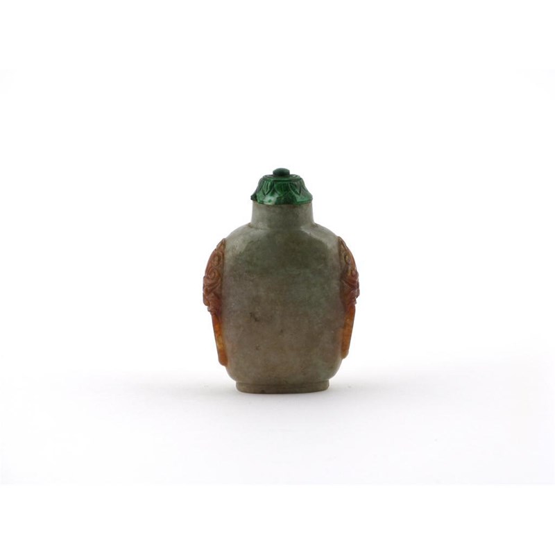 A Chinese jadeite snuff bottle 19th century, the stone a mottled celadon with russet markings to the mask and ring handles, 7cm.
