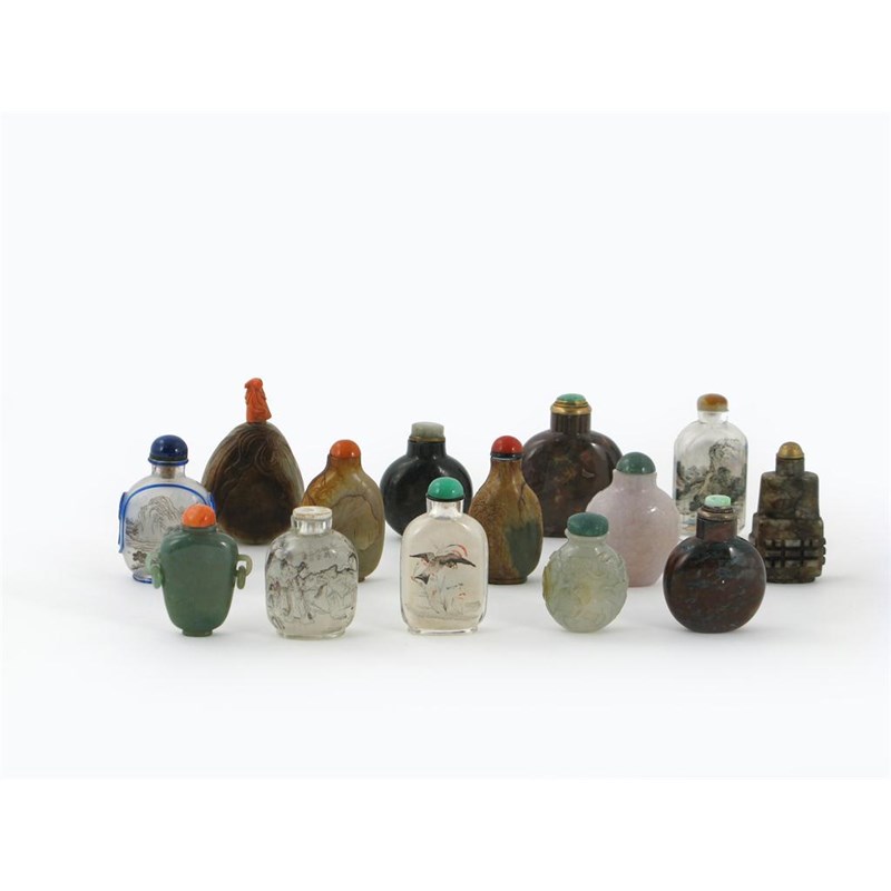 Fourteen Chinese snuff bottles 18th / 19th century, seven in jade, four interior painted and three hard stone, variously decorated with dragons, landscapes, animals and the trigrams. (14)