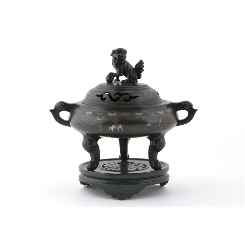 A Chinese bronze tripod censer, cover and stand 19th century, with a lion dog finial, the body inlaid in copper and silver with small figures beneath a band of ruyi heads, 26.5cm. (3)