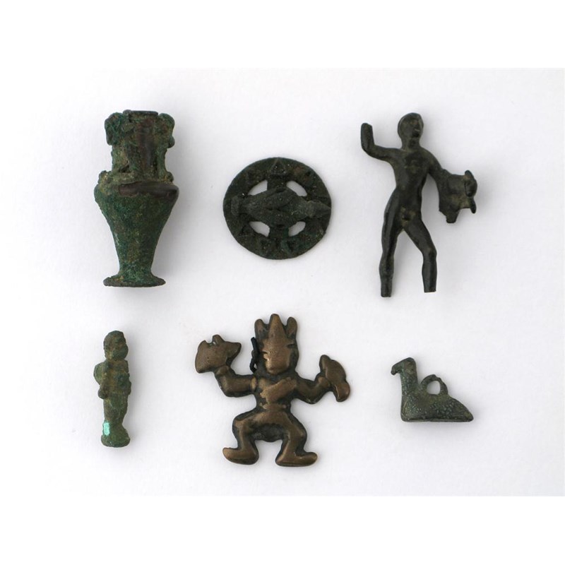 Six small bronze items, including three human figures, two birds and a vase, 7cm max. (6)