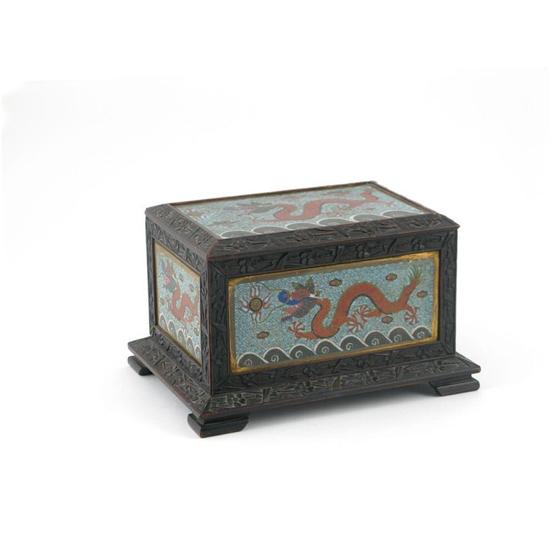 A Chinese cloisonné and carved wood casket c.1900, decorated with panels of dragons framed by borders carved of prunus, damages, 24.5cm.
