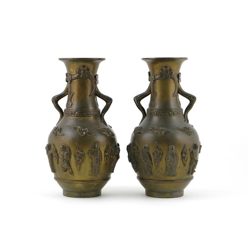 A pair of Chinese moulded brass vases 19th / 20th century, cast in high relief with figures, cloud scrolls and prunus, each with a six character Xuande mark, 39.5cm. (2)