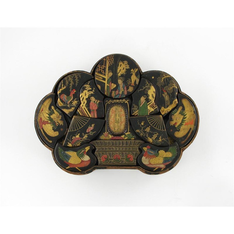 A black lacquer shaped box and cover 19th / early 20th century, containing an arrangement of smaller shaped boxes, painted in gilt and polychrome with birds, figures, mythical beasts and pagoda scenes, damages and wear, 43cm.