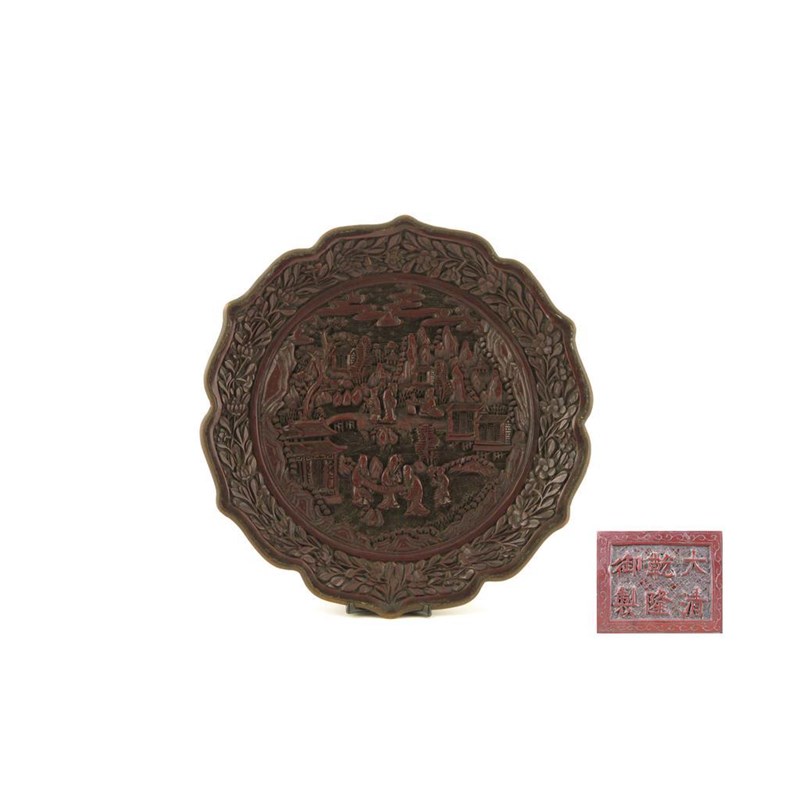 A Chinese lacquer dish six character Qianlong mark but later, carved in high relief with figures viewing a scroll in a pagoda landscape, 23cm.