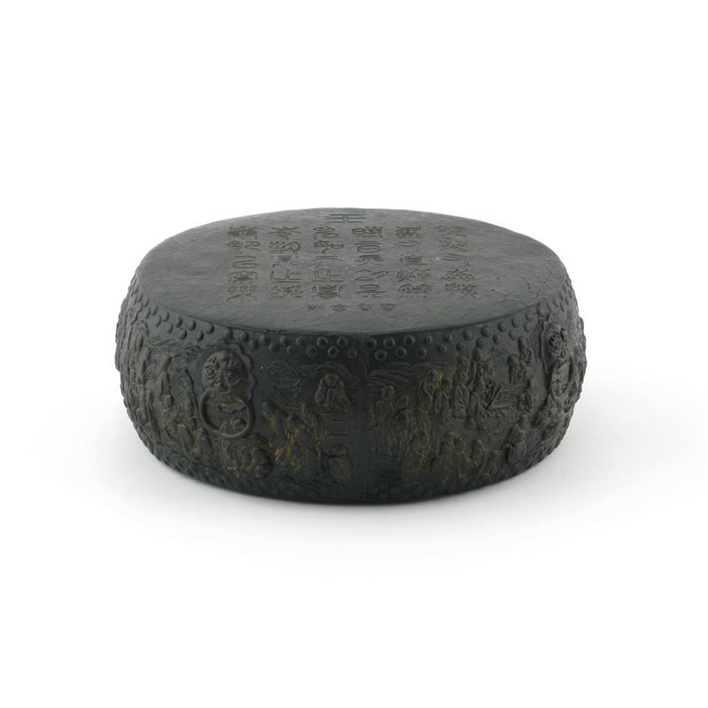 A large Chinese drum-shaped ink cake 19th century, moulded around the side with Immortals and figures in a landscape, the top and bottom decorated with six vertical rows of calligraphy, 21cm diameter.