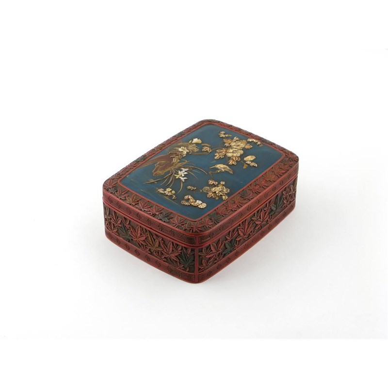 A rectangular red lacquer box and cover the sides carved with maple leaves, the top onlaid in ivory with a kingfisher perched on hibiscus above a pond, damages, 25.5cm. (2)