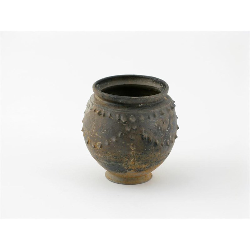 A Roman black pottery ovoid jar 1st-2nd century AD, decorated with a pattern of applied raised points, raised on a short flared foot, 9.4cm.