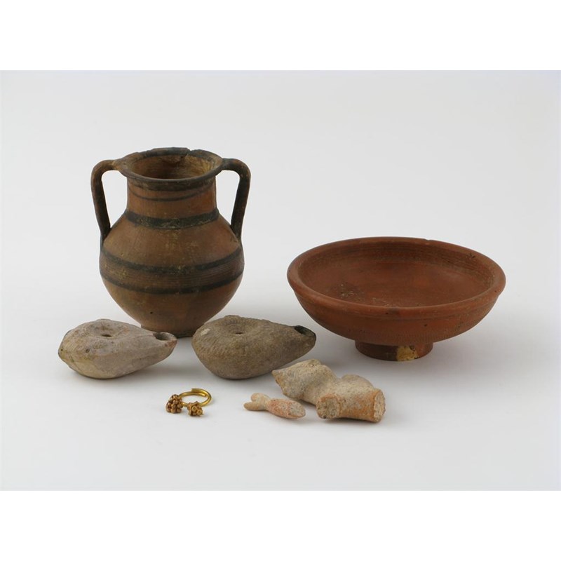 A Cypriot bichrome pottery amphora c.900 BC, two terracotta oil lamps, a Cypriot figure fragment, a terracotta shallow bowl and three miscellaneous gold items, 15.5cm.