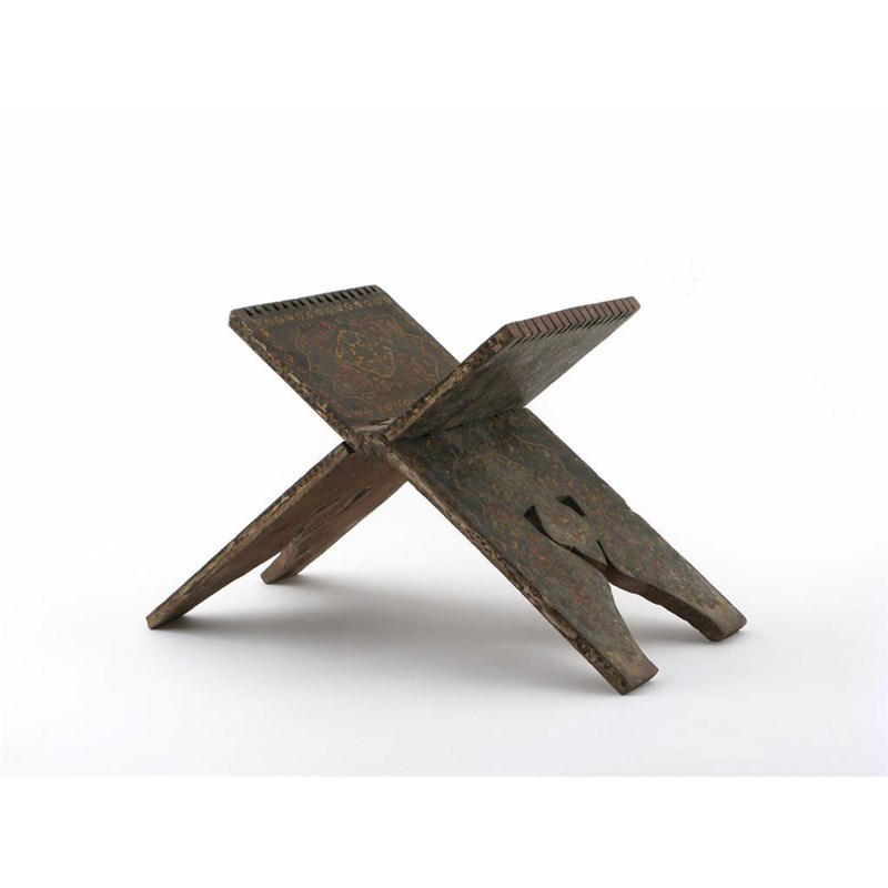 A folding wood Koran stand decorated with flowers and geometric patterns, distressed, 45cm.