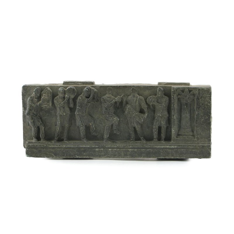 A Gandharan grey schist frieze c.2nd century AD, depicting six musicians beside a Corinthian column, 44cm.
