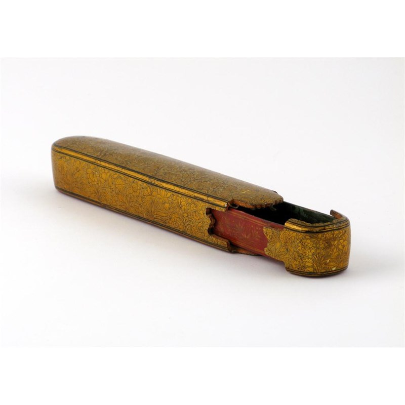 A Persian lacquer pen box 19th century, decorated with gold flowers and foliage, 24cm. (2)