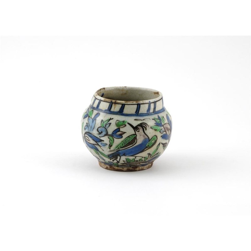 A small Persian Qajar globular vase, decorated in green, blue and brown enamels with a bird amidst flowers, 9.5cm high.