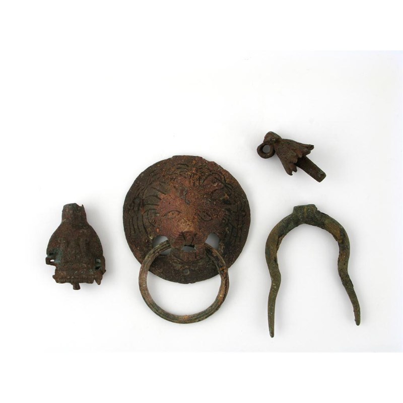 A Roman bronze lion mask handle 2nd century AD, and three miscellaneous bronzes, c.600 BC, comprising a pair of horns, a lotus flower amulet and a sistrum fragment cast with two heads of Hathor, 16cm. (4)