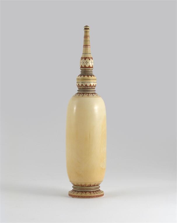 An ivory bottle vase probably 18th century India, the stopper formed as a turned finial decorated in red, gold and black with geometric designs, 29.8cm. (2)