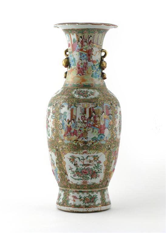 A Chinese Canton famille rose vase 19th century, with pomegranate handles and moulded lappets, the body painted with panels of figures, birds, flowers and insects, a little restoration, 61.5cm.