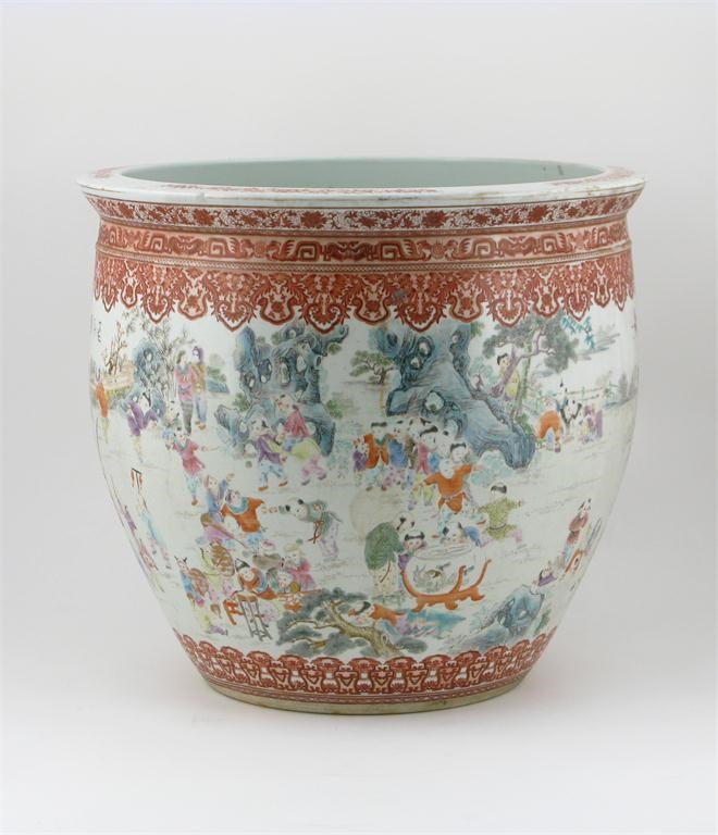 A large Chinese fish bowl 20th century, painted in famille rose enamels with children playing in a garden, and with calligraphy, cracks to the base, and wear, 54.5cm diameter.