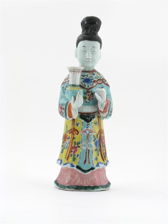 A Chinese famille rose figure of lady c.1800, standing wearing a decorative robe and holding a vase, some restoration, 31.5cm.