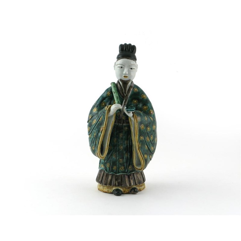 A Japanese Kutani figure 19th century, standing wearing flowing green robes and reading from a tablet, 29cm.