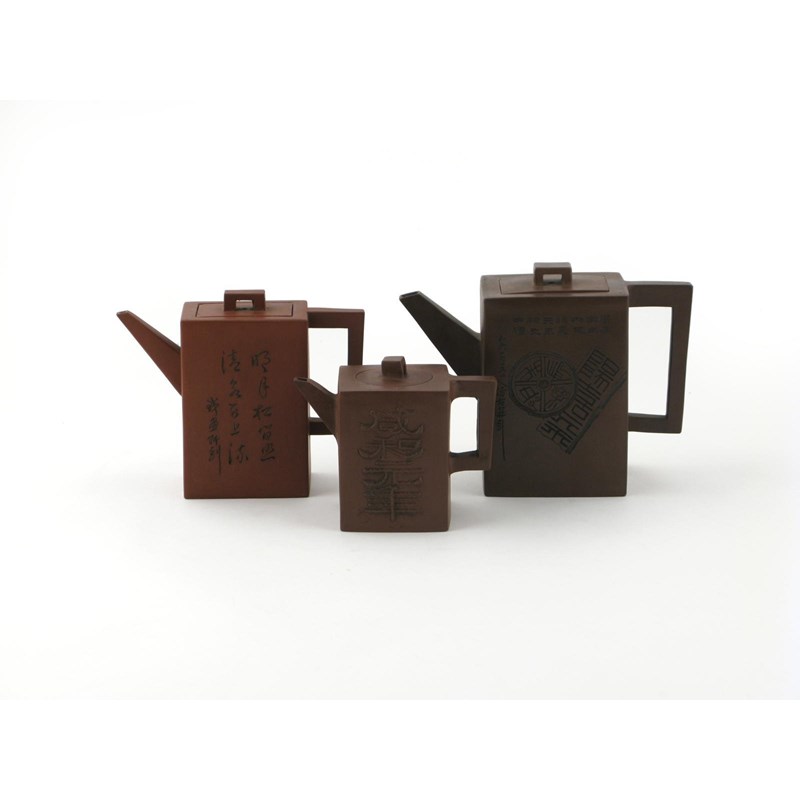 Three Yixing square section teapots and covers 18th / 19th century, variously decorated with a prunus branch, a figure in a landscape scene, calligraphy and Chinese characters, the two larger with seal marks, 23cm max. (6)