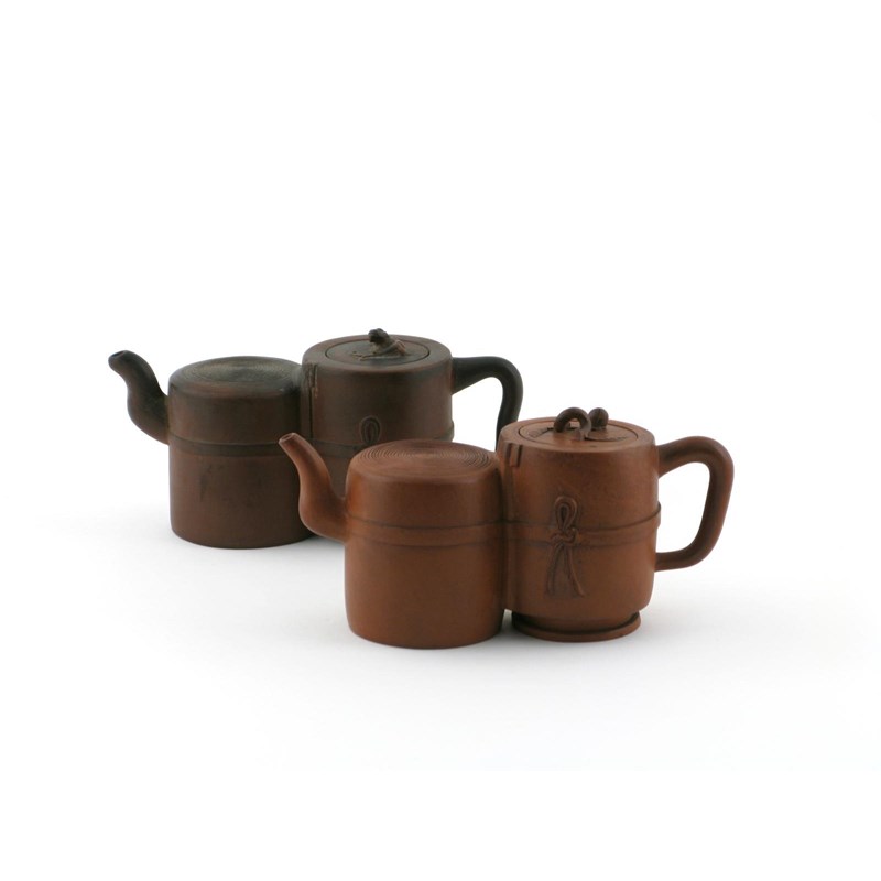 Two Yixing double teapots and covers 19th century, the bodies formed of two cylindrical barrels, the rear cylinder of each raised on a circular foot, 21.5cm. (4)
