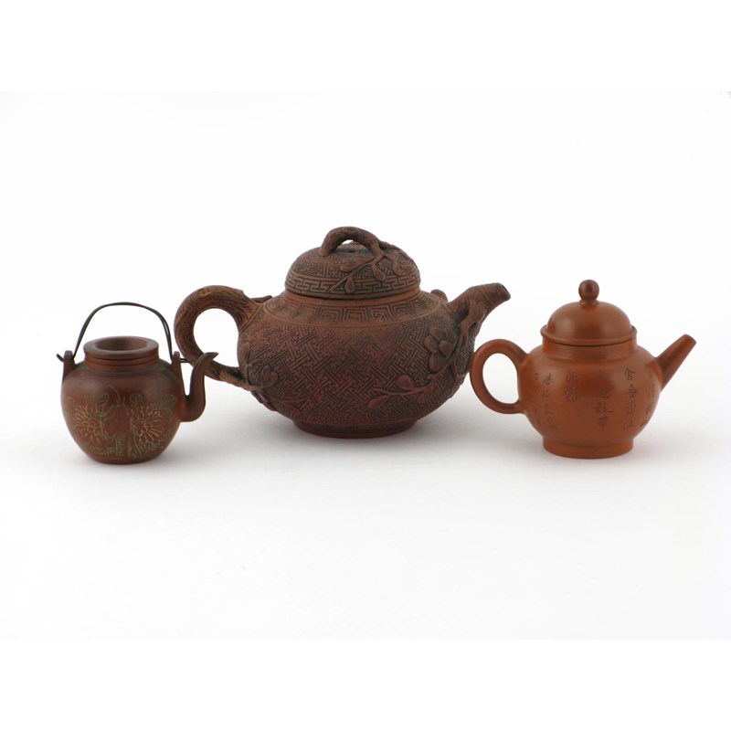 A lacquered Yixing teapot and cover 19th century, decorated with a key fret band above a herringbone design, and two miniature pots and covers, one with an inner liner, incised with calligraphy and chrysanthemum, 18.2cm max. (7)
