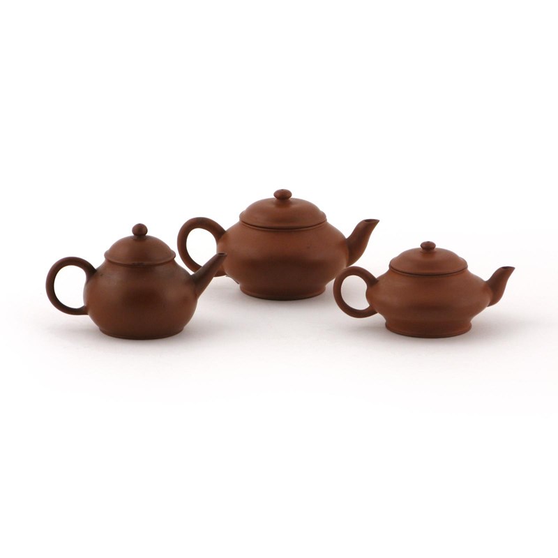 Three miniature Yixing teapots and covers 19th century, of varying form, all plainly modelled, two character mark to each base, 11.5cm max. (6)