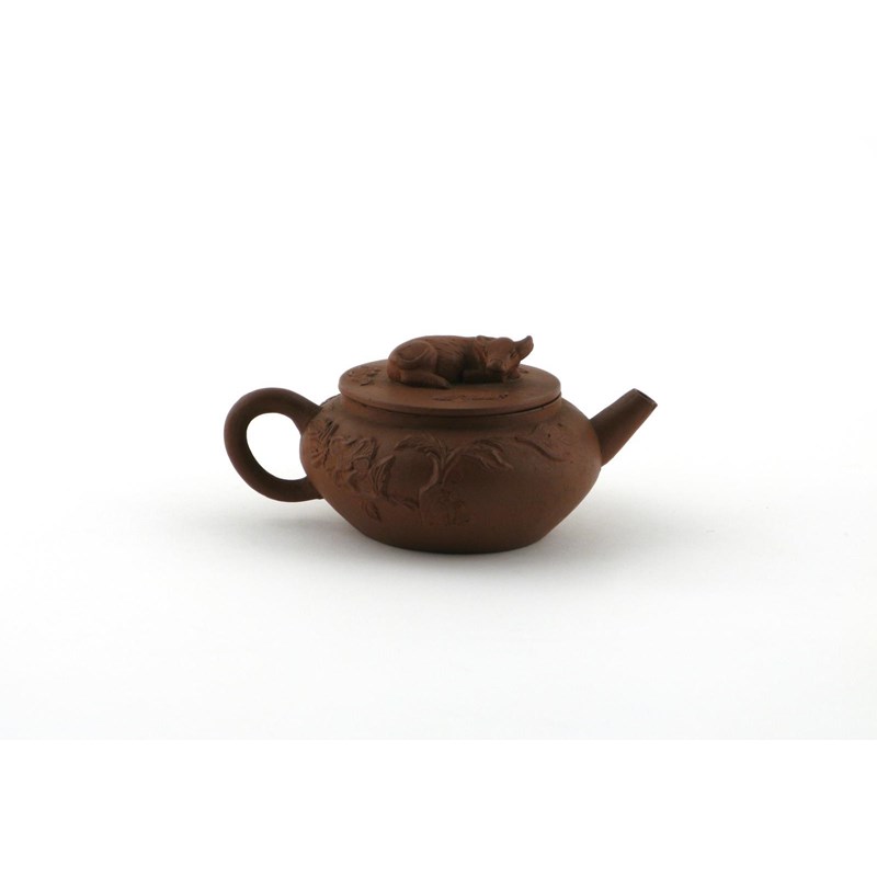 A small Yixing teapot and cover late 17th / early 18th century, the compressed globular body applied with chrysanthemum and peony sprays, the cover surmounted with a recumbent water buffalo, 13cm. (2)