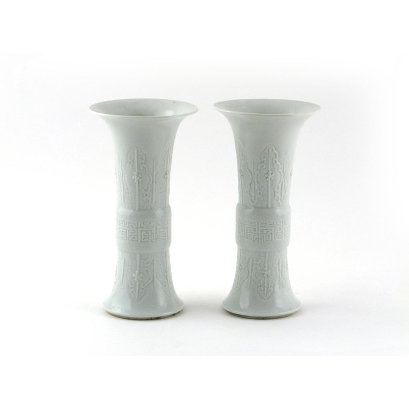 A pair of Chinese white glazed gu beaker vases 19th century, moulded with geometric bands and stylized stiff leaves, 24.4cm. (2)