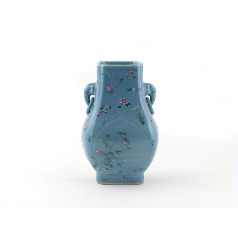 A Chinese hu-shaped vase six character Qianlong mark but later, the body moulded with peaches and painted with flowers and bamboo on a pale blue ground, 29.5cm.