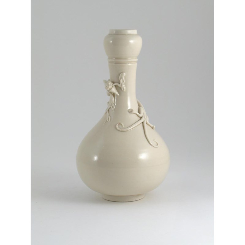 A Chinese blanc de Chine bottle vase of bronze form c.1640, with a ribbed slender neck with a garlic bulb below the mouth, entwined in high relief with a chilong dragon holding a leafy branch in its mouth, a little polishing to the mouth, 25.3cm.