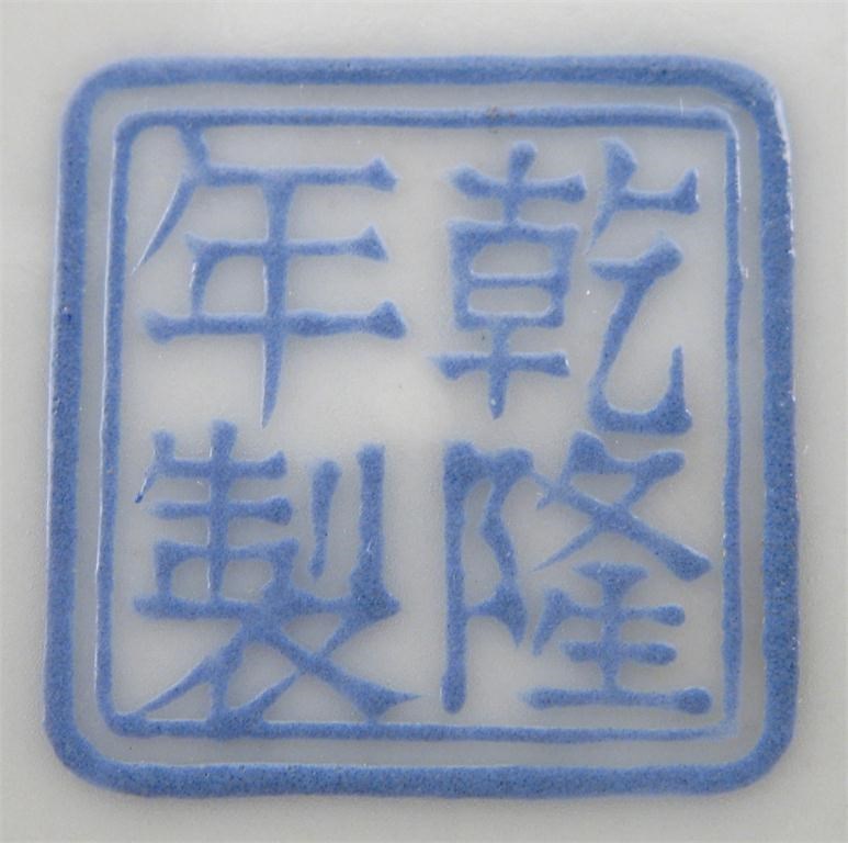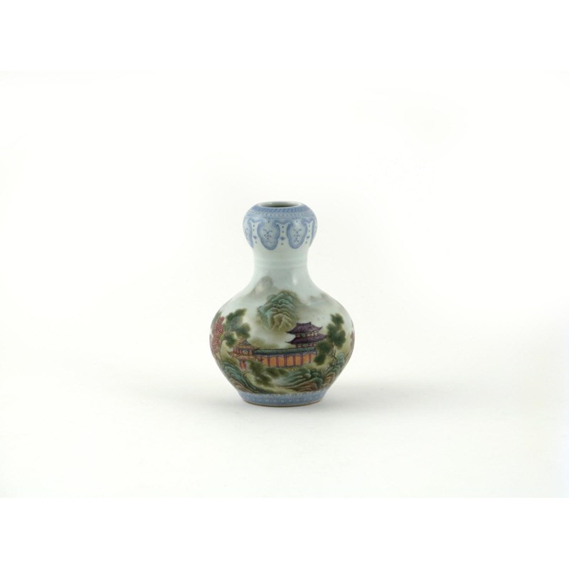 A small Chinese famille rose vase four character Qianlong mark but later, painted with a pagoda landscape and with figures in a small boat, the reverse with calligraphy, 11.7cm.