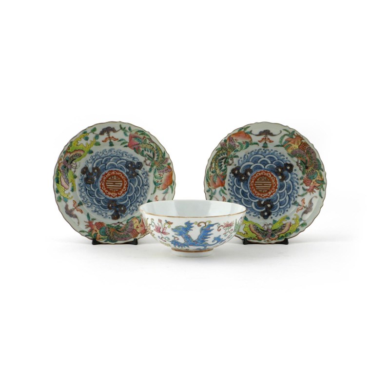 A pair of Chinese porcelain fengcai and underglaze blue saucers Jiaqing seal marks and perhaps of the period, decorated with pomegranates, citron and peaches around a central shou character, and a fengcai small bowl enamelled with dragons, Tongzhi seal mark, 13.2cm max. (3)