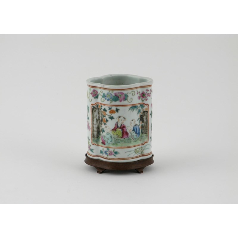 A Chinese famille rose brush pot c.1900, the quatre-lobed body painted with two panels of children, the base with a six character iron-red mark, together with a hardwood stand, 10cm. (2)