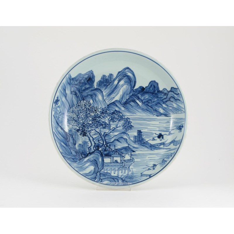 A good Chinese blue and white Master of the Rock dish early Kangxi c.1670, painted with three small figures and huts beneath trees in a mountainous landscape, a channelled footrim, 27.5cm.