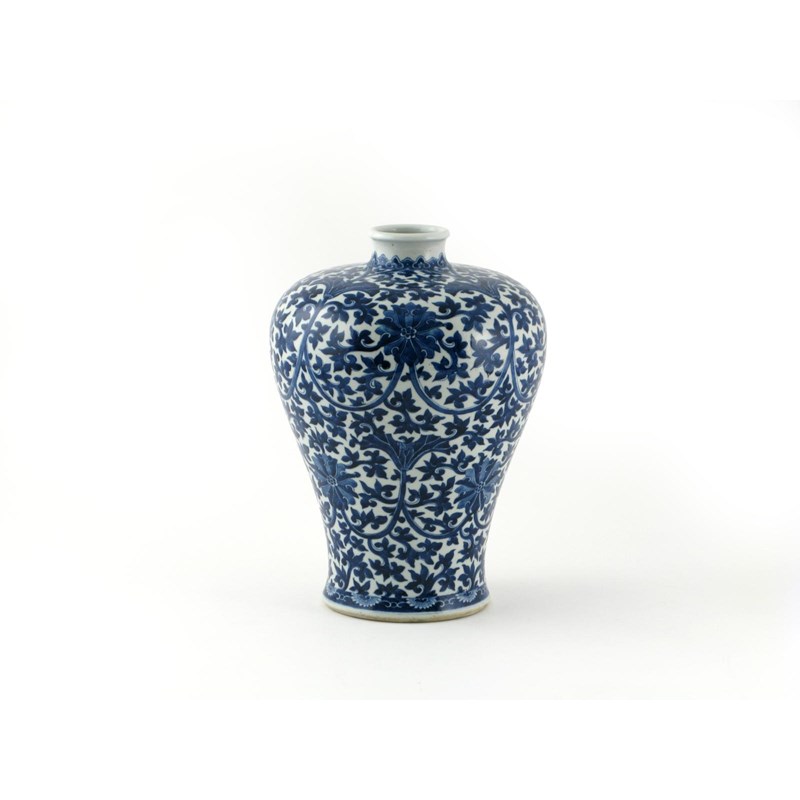A good Chinese blue and white meiping vase 19th century, brightly painted with an all-over stylized lotus design of leaves and flower heads, the narrow neck with a band of ruyi heads, the foot with chrysanthemum motifs, 32.5cm.