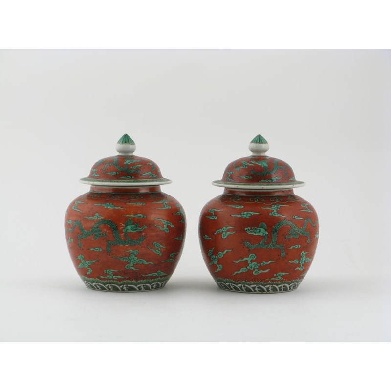 A pair of Chinese Ming-style vases and covers 19th century, each decorated with green dragons amidst cloud scrolls on a coral red ground, six character Wanli marks, 22cm. (4)