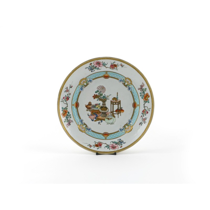 A Chinese famille rose plate 18th century, brightly enamelled with an arrangement of vases, one issuing a chrysanthemum and lingzhi, the border with four fruiting and flowering branches, a small rim chip, 23.6cm.