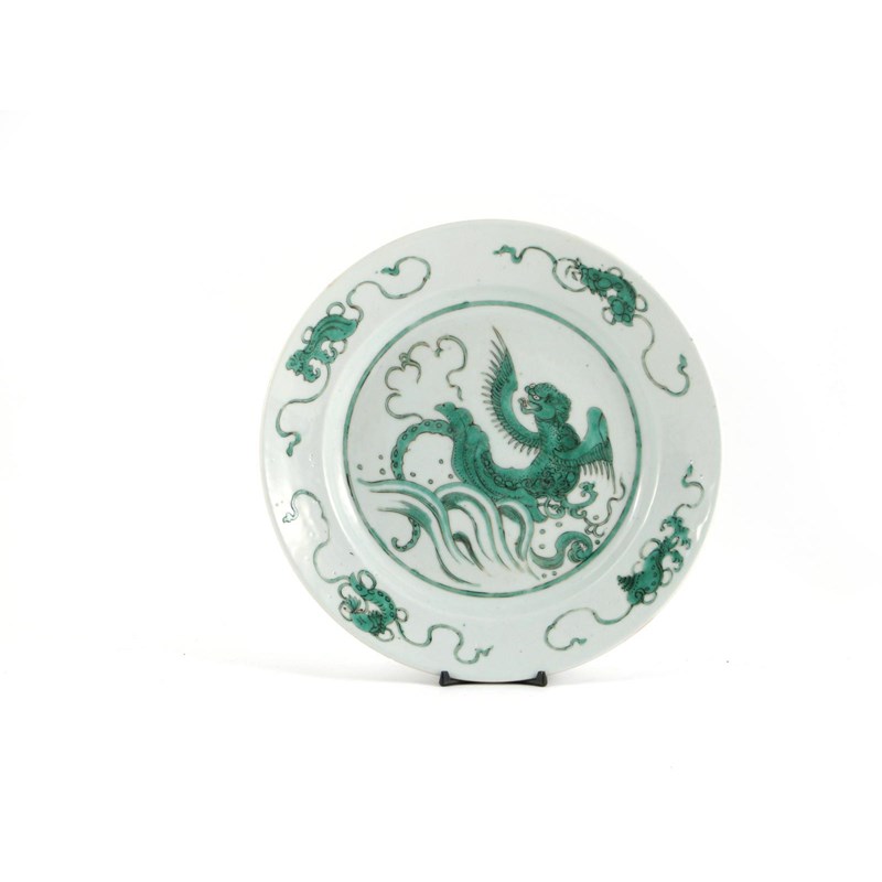 A Chinese green enamelled dish 18th century, painted with a winged sea dragon, and with conch shells and sea creatures to the border, 21.2cm.
