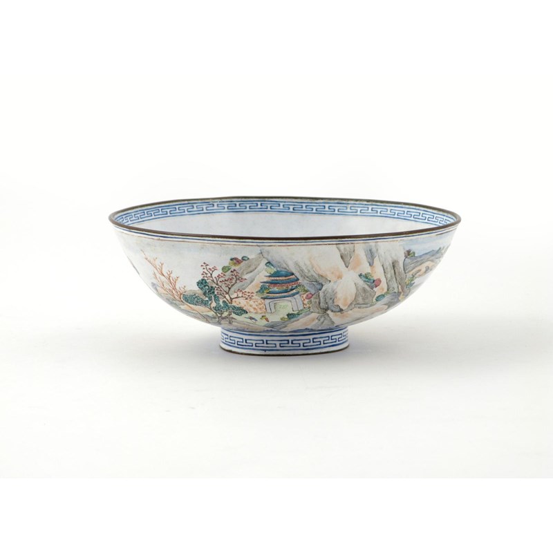 A Chinese Canton enamel bowl 18th century, the exterior decorated with small figures, pagodas and rockwork above a band of blue ruyi heads, the foot with a key fret, the interior with fruit and flowers, a little restoration, 18.8cm.