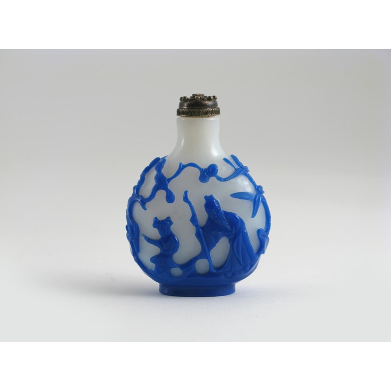A Chinese blue overlaid glass snuff bottle probably Qianlong, finely carved with two figures to each side, one in a boat with a fishing rod, amidst pine and bamboo, 6.6cm.