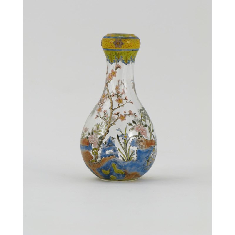 A Chinese small enamelled glass vase four character Qianlong mark and possibly of the period, delicately painted with flowers, bamboo and rockwork, with a butterfly and other insects in flight, the rim with purple flowers on a yellow band, 11.2cm.
