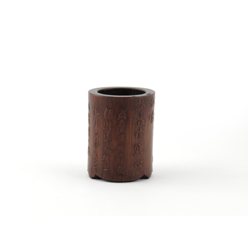 A Chinese bamboo brush pot 18th / 19th century, carved with columns of calligraphy, the base shaped with three rudimentary feet, 14.3cm.