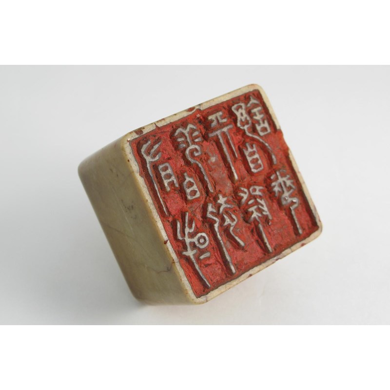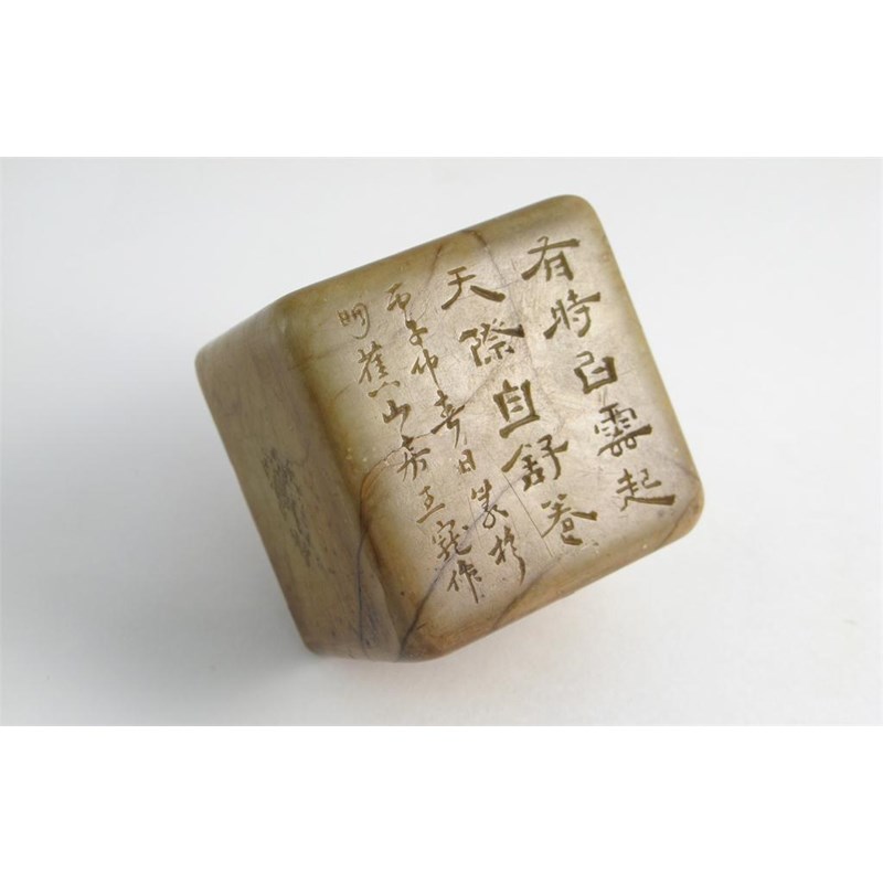 A Chinese soapstone seal probably 19th century, the top carved with four columns of calligraphy, the stone with brown striations, 5.5cm.