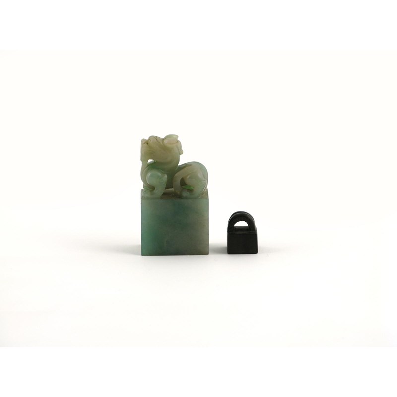 A Chinese jadeite seal 19th century with a dragon surmount and a small bronze seal, 7cm. (2)