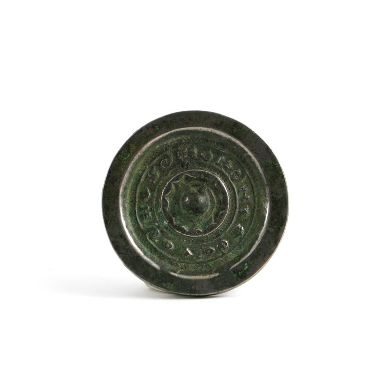 A Chinese silvered bronze small mirror probably Tang dynasty, decorated with geometric designs around a central ring handle, the face with verdi gris, 7.9cm diameter.