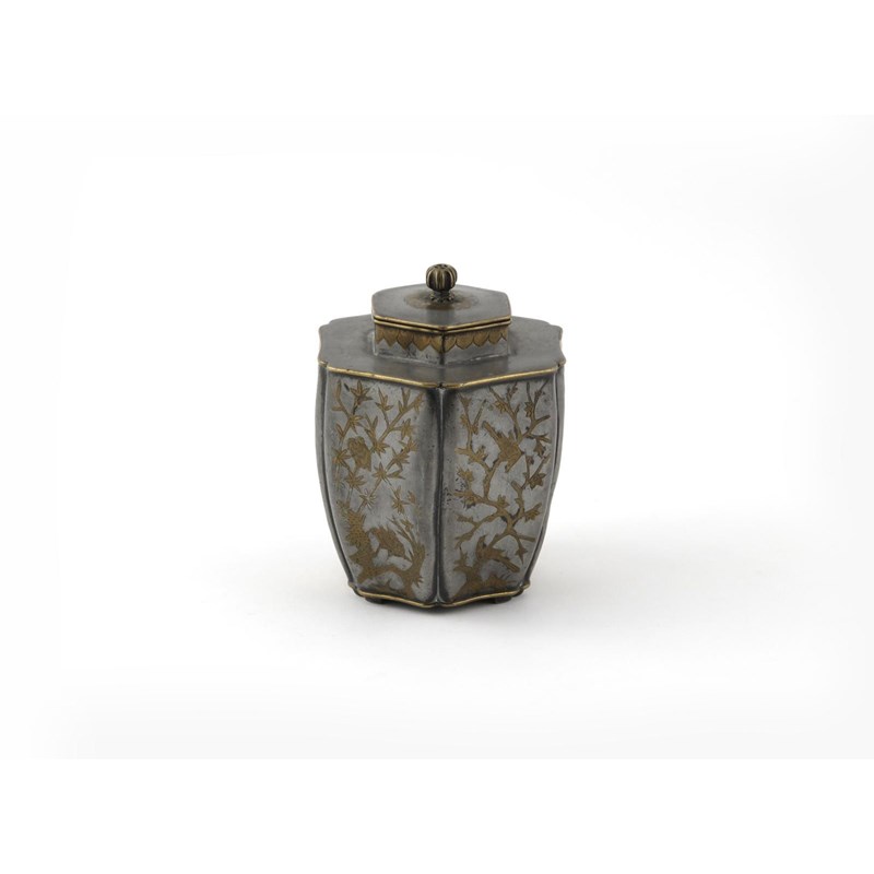 A Chinese pewter hexagonal tea canister and cover 18th / 19th century, decorated in gilt with panels of birds amidst flowering and fruiting tree branches, all on three stump feet, 14.5cm. (2)