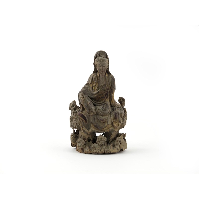 A Chinese carved wood figure of Guanyin probably 17th century, seated wearing loose flowing robes, raised on pierced rock work, old wear and worm damage, 24cm.