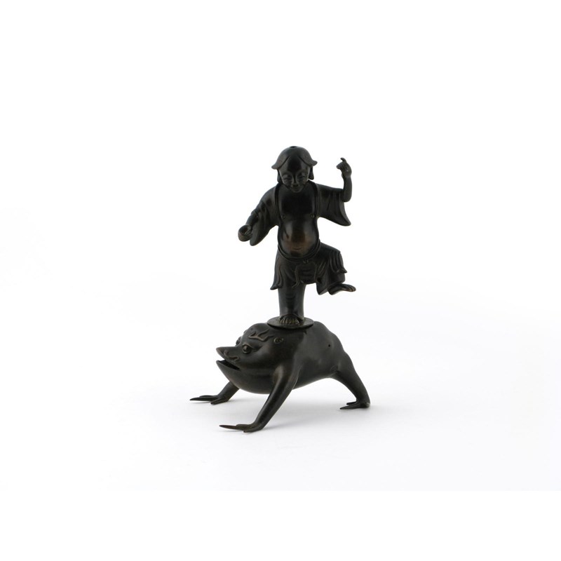 A Chinese bronze model of Liu Hai 17th century, standing on one leg upon the back of his three-legged toad, 22.5cm. (2)