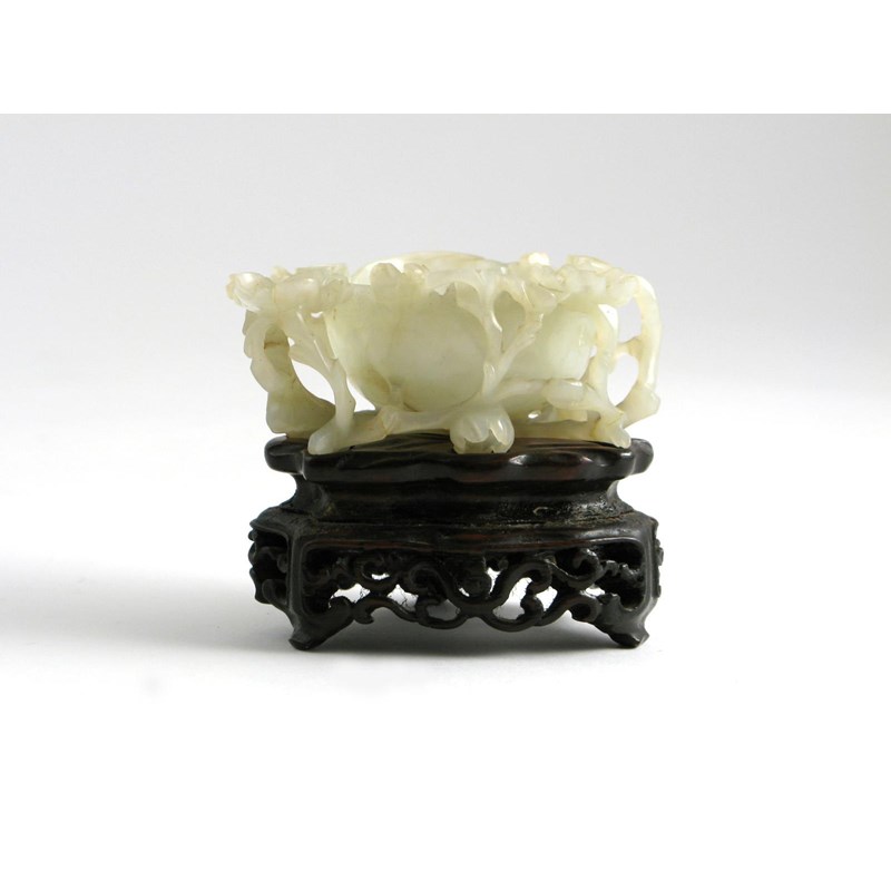 A Chinese pale celadon jade cage cup 16th / 17th century, carved as a flowerhead around which small blossoms and gnarled branches grow, together with a hardwood stand, minor damages, 8cm. (2)