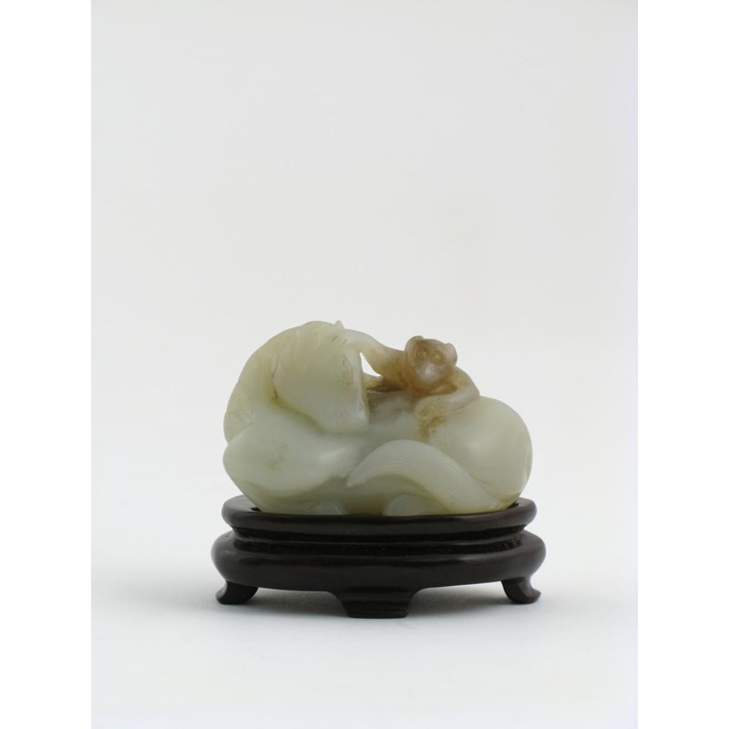 A Chinese pale celadon jade carving of a recumbent horse 18th/19th century, with its head turned and with a monkey clambering over its back, with a wood stand, 5cm. (2)